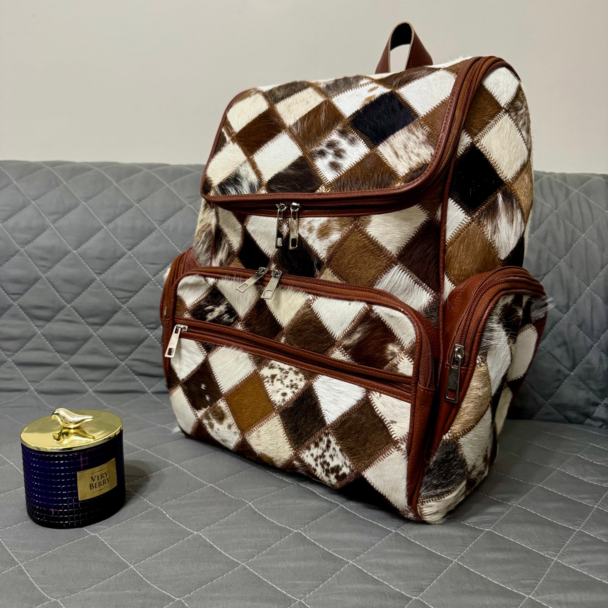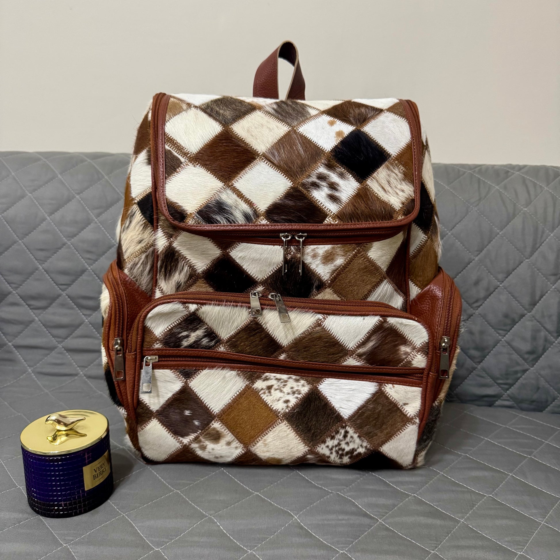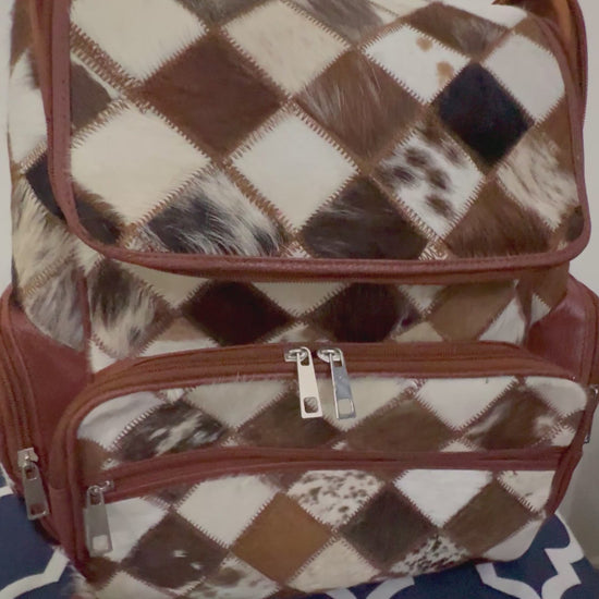 Cowhide Diaper Backpack Bag, Cowhide Backpack Bag, Brown White Cowhide Large Backpack